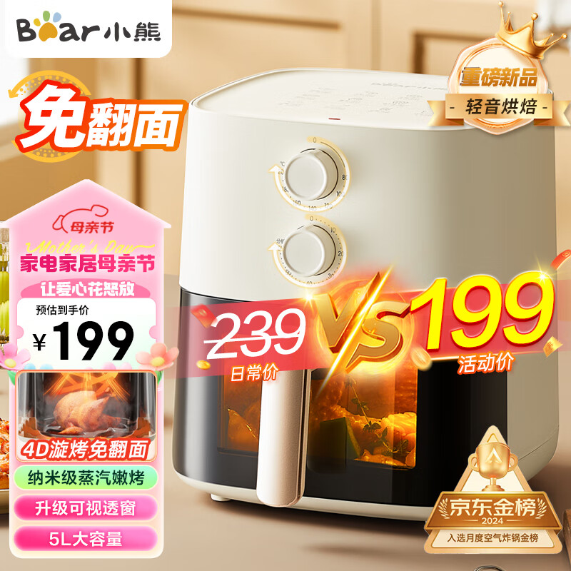 小熊(Bear)空气炸锅大容量5升可视全自动不用翻面家用排行榜多功能低脂微蒸汽嫩烤双旋钮操控低音 QZG-J15M1价格:199.00元!