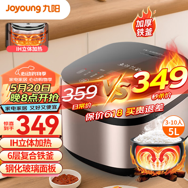 九阳(Joyoung)5L大容量3~10人电饭煲Pro电饭锅智能预约多功能触控面板6层复合铁釜内胆1200W IH电磁加热5升50T7价格:399.00元!