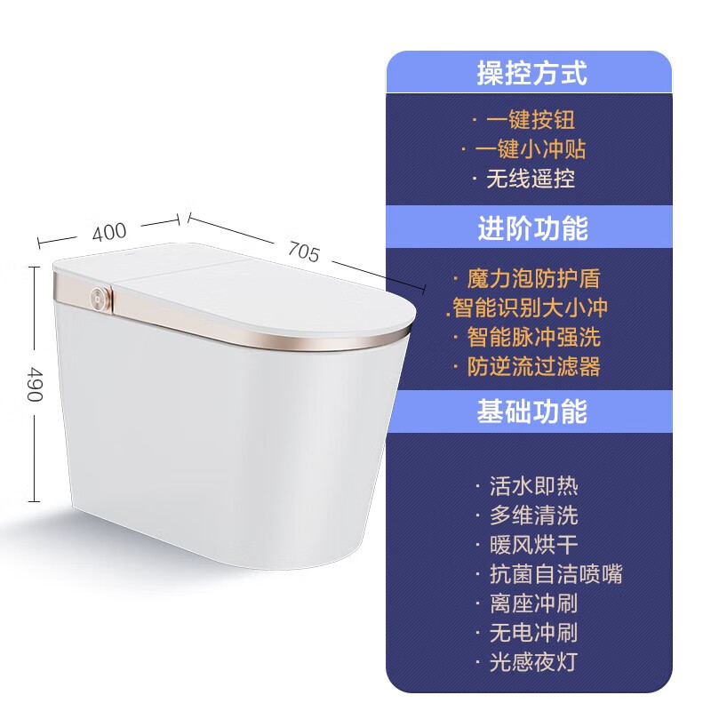 功能:暖风烘干,自动除臭,按摩清洗,臀部清洁,座圈加热,喷嘴自洁,女性清洗,喷嘴移动清洗,记忆功能,净化水质,水温调节,水压调节,风温调节,坐温调节,柔和夜灯