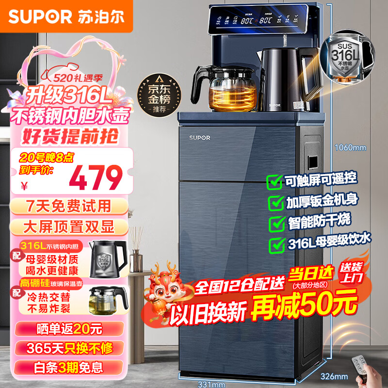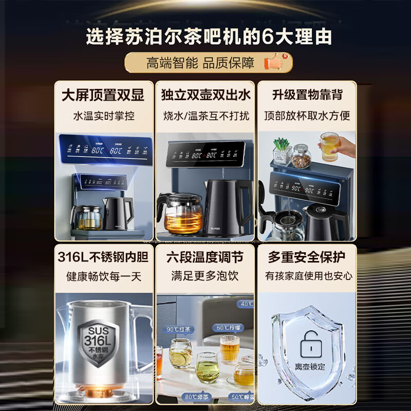 苏泊尔(SUPOR)茶吧机 家用高端饮水机 遥控智能下置水桶 全自动自主控温防干烧316L水壶泡茶机 CBJ12【温热款】价格:479.00元!