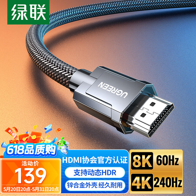 绿联HDMI线2.1版8K60Hz 4K240Hz高清视频连接线兼容HDMI2.0笔记本电脑机顶盒接电视显示器投影仪3米价格:139.00元!