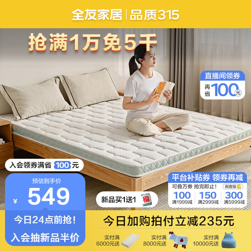 全友家居 薄款3D护脊椰棕床垫1.35x2米单人宿舍学生席梦思床垫117017价格:784.29元!