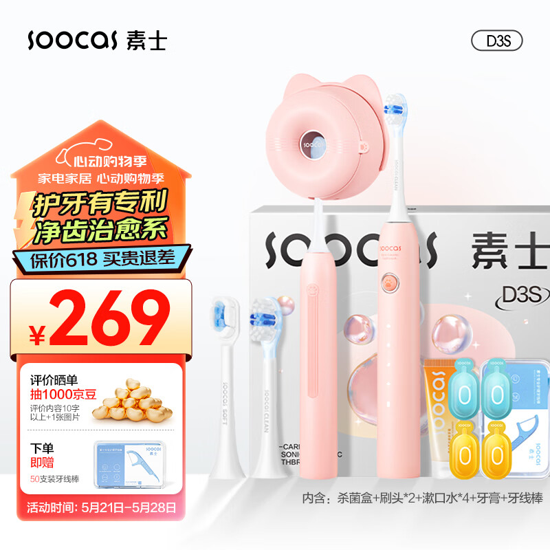 素士 SOOCAS 声波电动牙刷成人 亮白去渍杀菌猫爪刷礼盒 免打孔情侣款 D3S粉 送女友 520情人节礼物价格:292.40元!