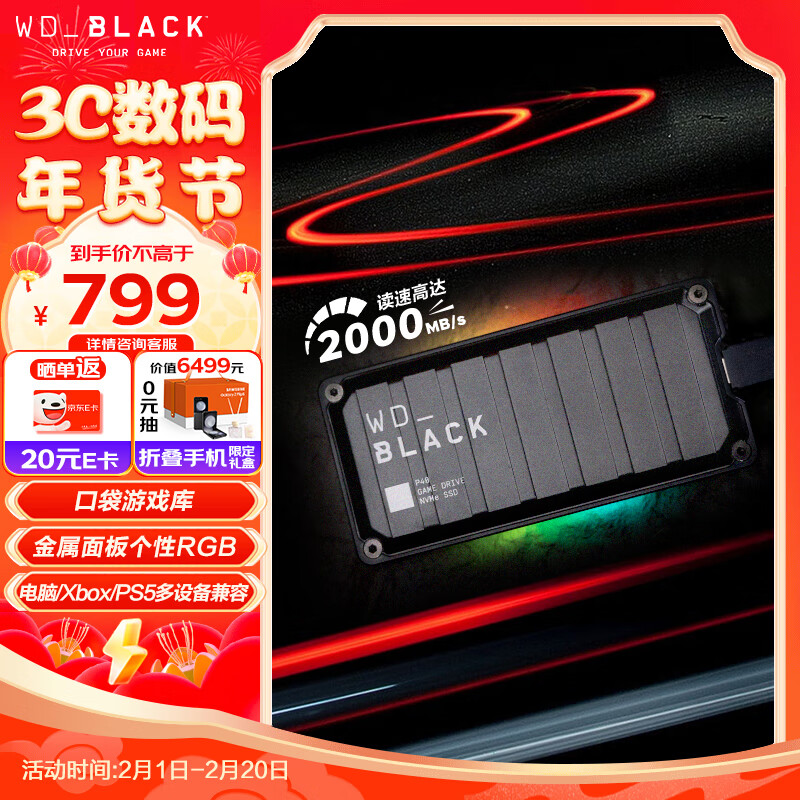 西部数据(WD)1TB NVMe 移动固态硬盘(PSSD)P40 type-c 游戏硬盘ssd外接xbox手机笔记本拓展存储2000MB/s价格:799.00元!