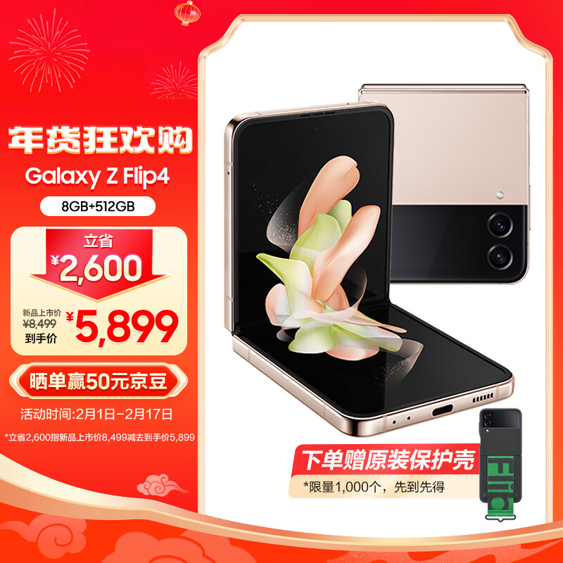 三星 SAMSUNG Galaxy Z Flip4 掌心折叠设计 立式自由拍摄 拍照手机 8GB+512GB 5G折叠屏手机 繁樱花园价格:5899.00元!