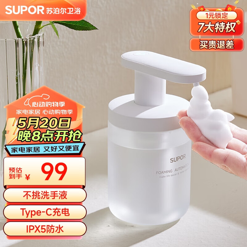 苏泊尔自动感应泡沫洗手机 免接触洗手液出泡机免打孔皂液器IPX5充电款价格:99.00元!