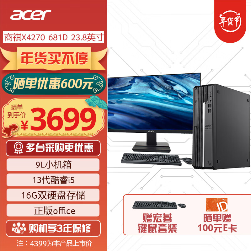 宏碁(acer)商祺X4270 681D 23款商用办公电脑台式主机 (酷睿13代i5-13400 16G 512G+1T) 23.8英寸显示器套机价格:3799.00元!