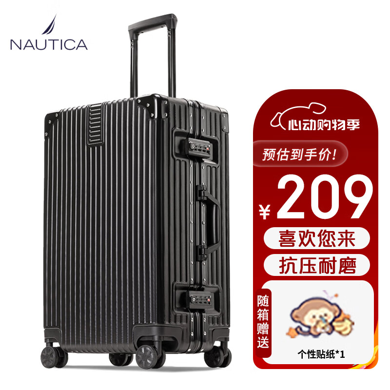 NAUTICA铝框行李箱男万向轮黑色拉杆箱商务大容量旅行箱女24英寸密码箱价格:209.00元!