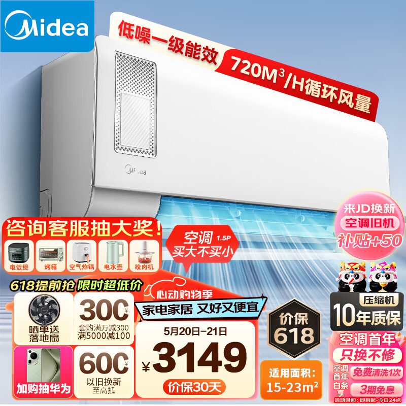 美的(Midea)新风空调挂机1.5匹 新一级能效 变频冷暖卧室家用壁挂 空调挂机 智能家电KFR-35GW/N8XF1-1价格:3149.00元!