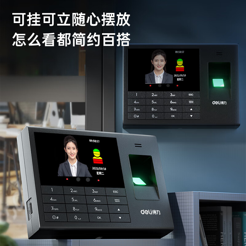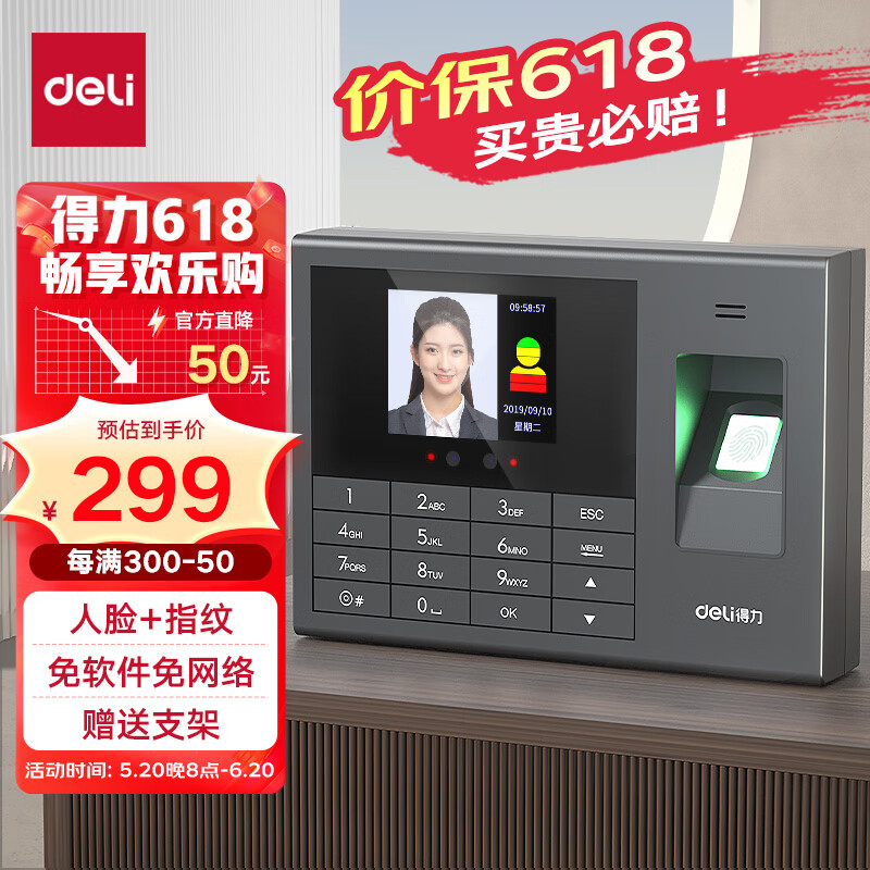 得力考勤机 打卡机人脸+指纹 人脸指纹打卡考勤机 无需网络 设置简单 自动生成报表 自带支架33868价格:349.00元!