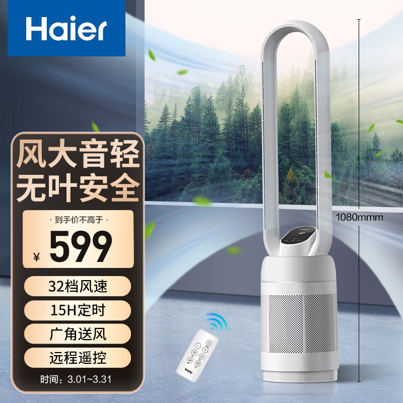 海尔(Haier)无叶风扇家用办公室空气循环扇直流变频落地扇风扇塔扇立式电风扇 遥控款HFW-J09价格:699.00元!