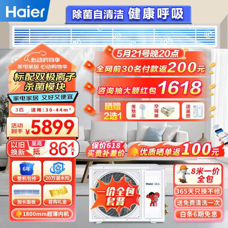 海尔(Haier)风管机一拖一中央空调大3匹荣御变频双极离子除菌3p智能wifi自清洁 KFRD-72NW/65DDA22SU1价格:5899.00元!