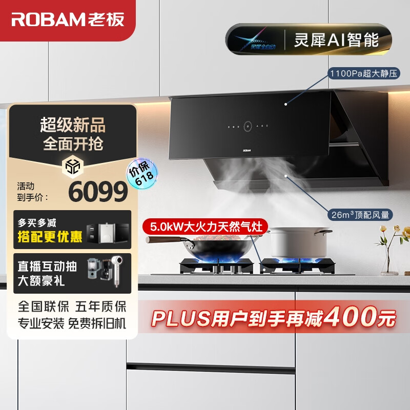 老板(Robam)【灵犀AI智能】侧吸变频26m3抽油烟机家用大吸力燃气油烟机燃气灶烟灶套装29A9S+57B2D(天然气)价格:6999.00元!