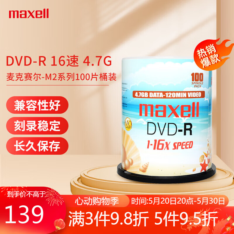 麦克赛尔(Maxell)DVD-R光盘 刻录盘 光盘 光碟 M2系列16速4.7G 珍珠白桶装100片价格:129.00元!