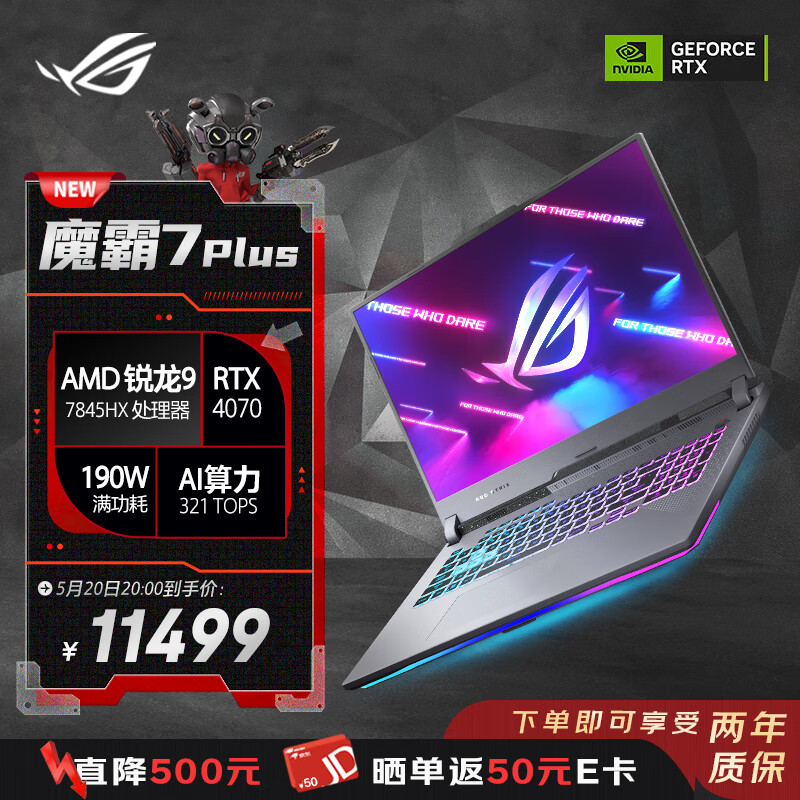 ROG魔霸7 Plus 17.3英寸 电竞游戏本笔记本电脑(R9 7845HX 液金导热 16G 1T RTX4070 240Hz P3广色域)价格:11499.00元!