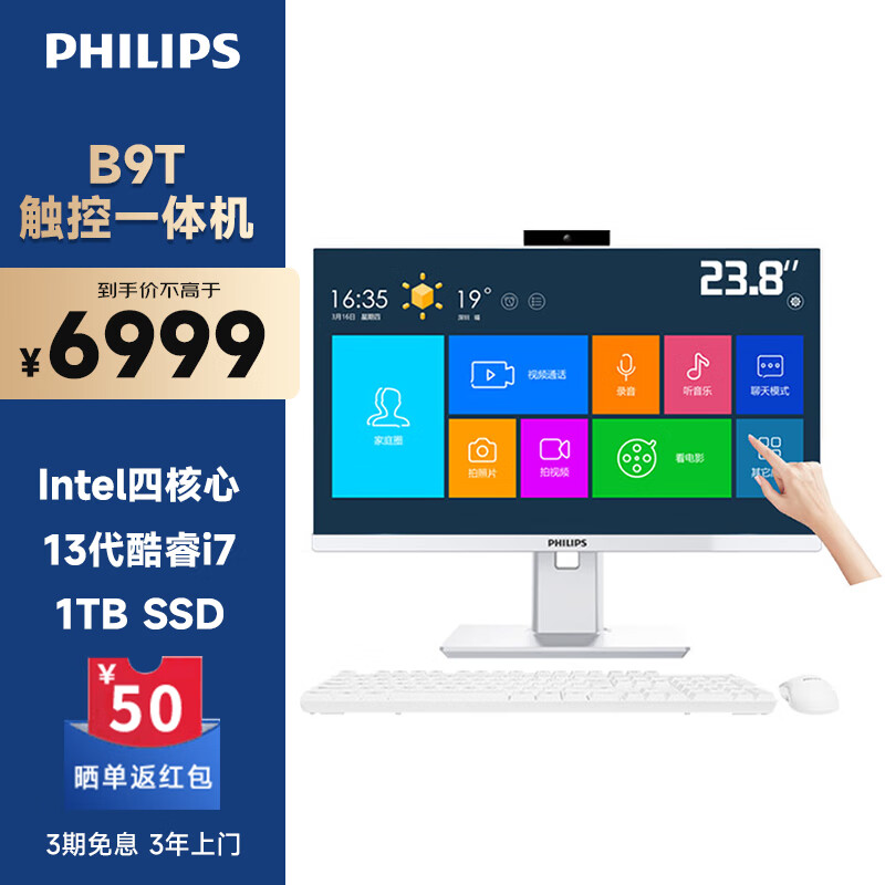 飞利浦B9T 23.8英寸触控台式一体机电脑 网课办公门店收银(13代i7-13700 16G 1TB SSD 旋转升降 摄像头)白色价格:6999.00元!
