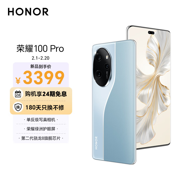 荣耀100 Pro 单反级主摄 荣耀绿洲护眼屏 第二代骁龙8旗舰芯片 立体声双扬声器 OIS 12+256 迷蝶蓝 5G价格:3399.00元!