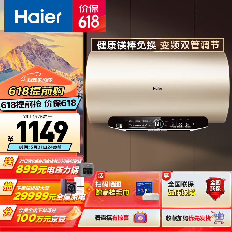 海尔(Haier)60升【金刚无缝胆】3300W变频大功率速热电热水器家用储水式大水量免换镁棒一级能效 EC6002-JT3U1价格:1149.00元!