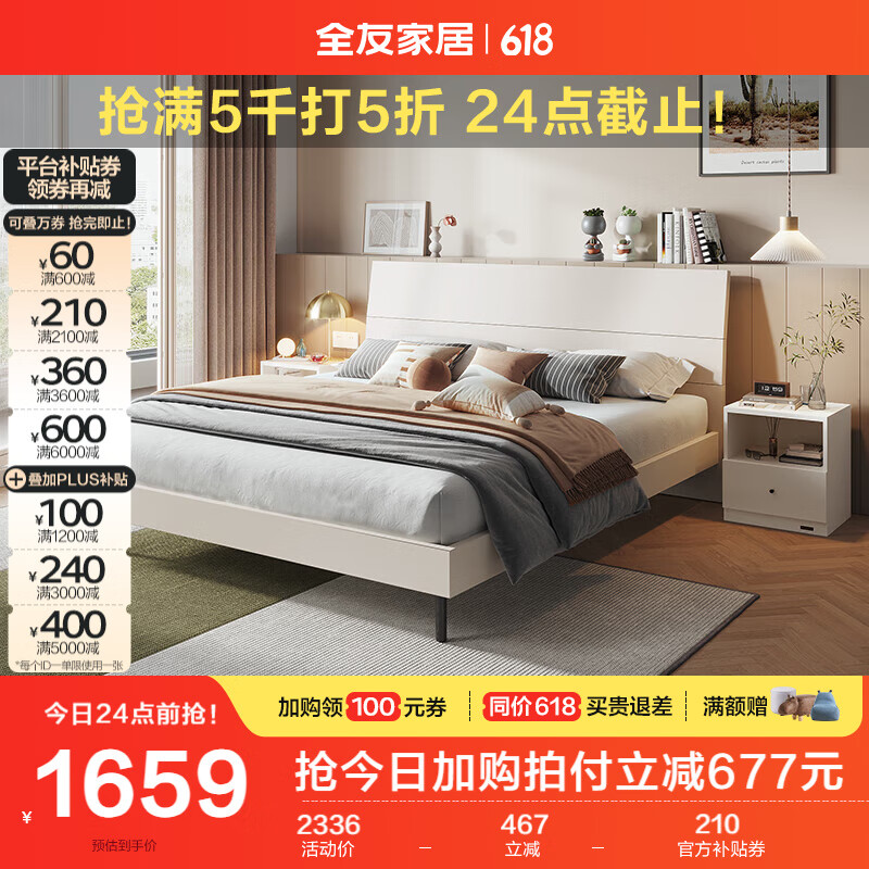 全友家居 现代简约家用高脚板式床主卧室床1.8x2米双人大床家具106302价格:2336.25元!