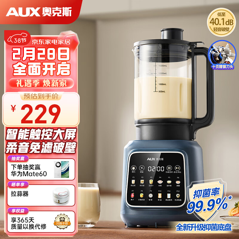 奥克斯(AUX)轻音破壁机家用豆浆机多功能榨汁机全自动加热破壁料理机1.65升预约早餐机APB-08APPB03价格:229.00元!