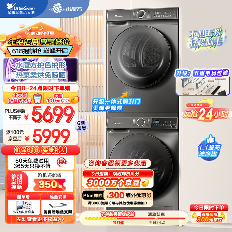 小天鹅(LittleSwan)水魔方洗烘套装 10KG滚筒洗衣机全自动+热泵烘干机 除菌除螨 TG100V618T+617MAX价格:6099.00元!