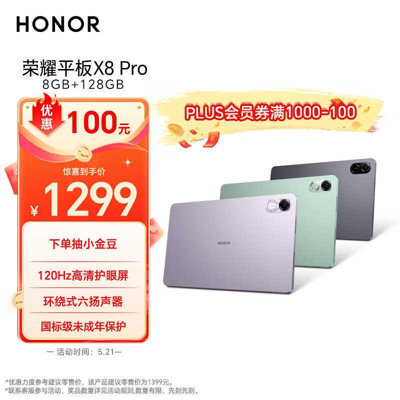 荣耀平板X8 Pro 11.5英寸平板电脑(8+128GB 2K高清120Hz高刷护眼屏 全金属轻薄机身)珊瑚紫价格:1299.00元!