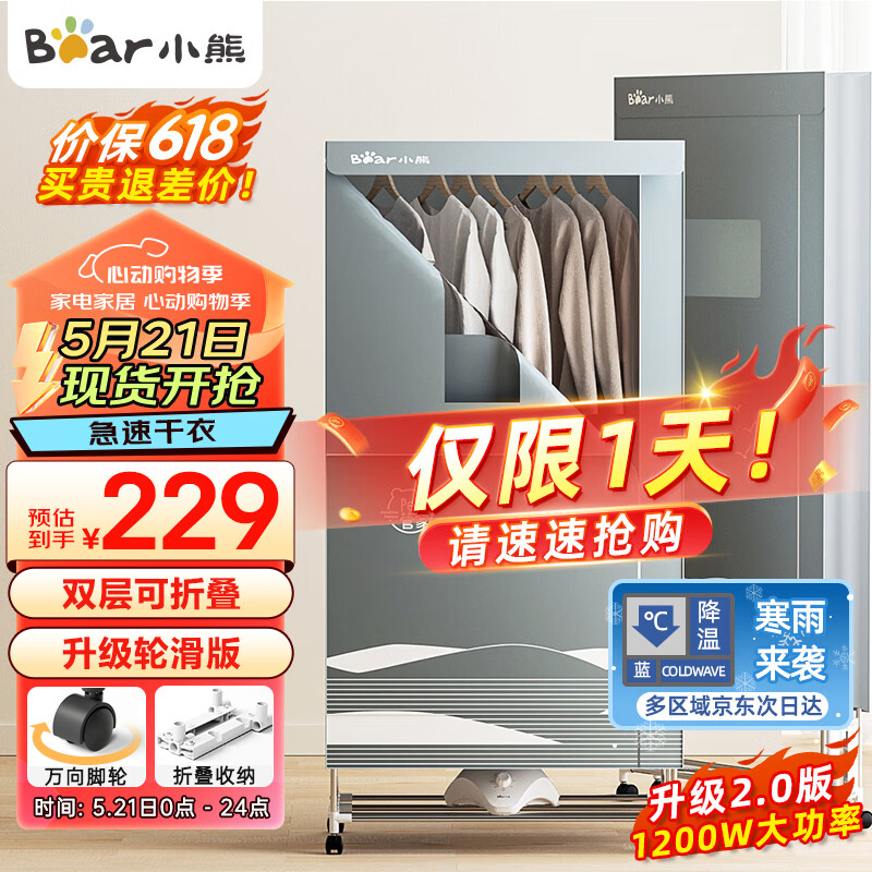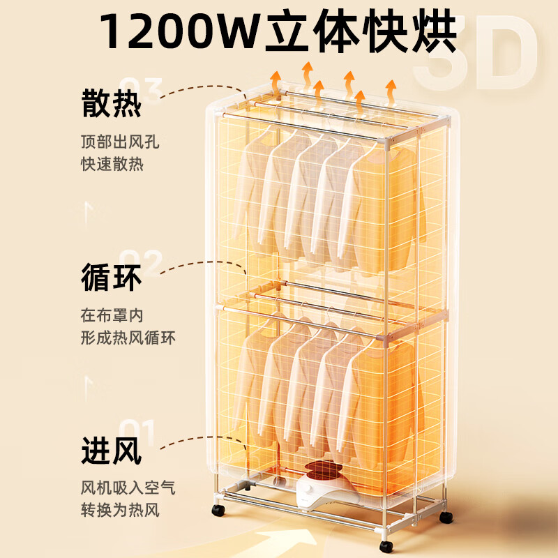 小熊(Bear)烘干机家用干衣机折叠可视化轮滑烘衣机布罩类衣柜婴儿衣物暖风大容量内裤内衣烘干HGJ-D12X5价格:229.00元!