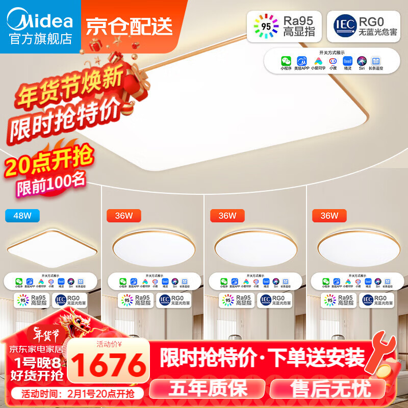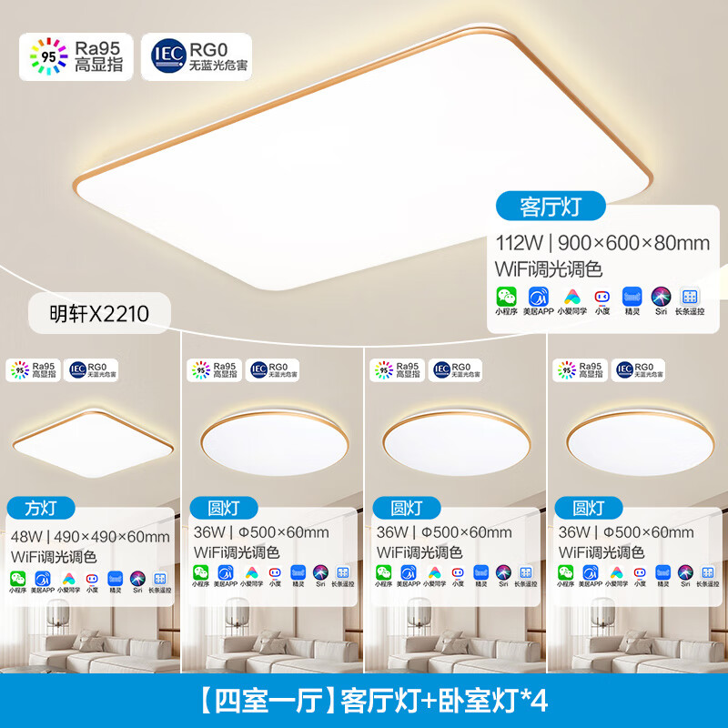美的(Midea)LED吸顶灯客厅大灯卧室书房餐厅高显指护眼智能灯具四室一厅套餐价格:1676.00元!