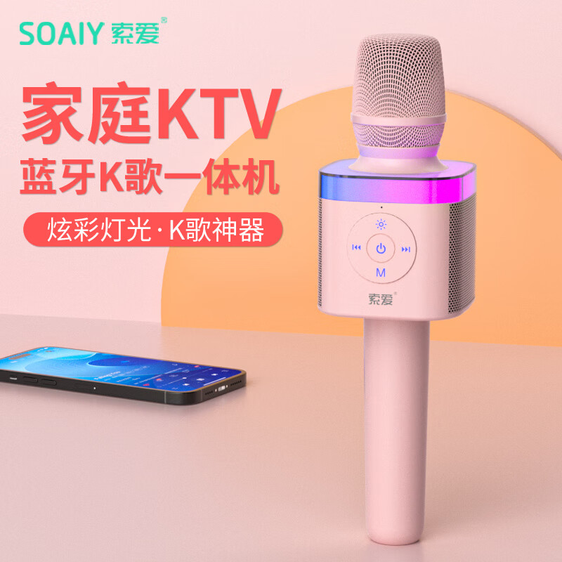 索爱(soaiy)MC62 音响一体麦克风唱歌录音声卡拉ok套装k歌宝无线蓝牙儿童话筒家庭ktv【少女粉】价格:199.00元!