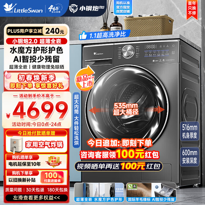 小天鹅滚筒洗衣机全自动10公斤 洗烘一体带烘干【小钢炮2.0】超薄大筒径 超微净泡水魔方TD100VP28MAX价格:4699.00元!