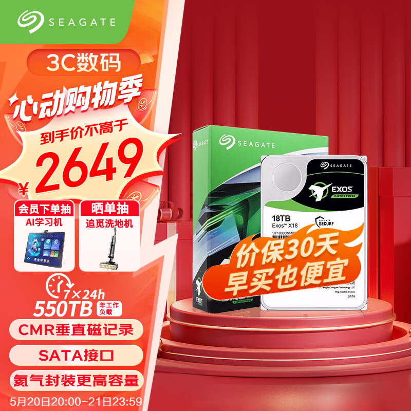 希捷(SEAGATE)企业级硬盘 18TB 256MB 7200RPM CMR垂直 SATA 希捷银河Exos X18系列 服务器硬盘价格:2649.00元!