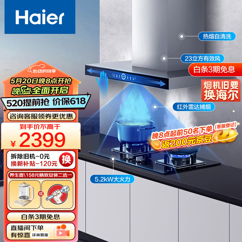 海尔(Haier)抽油烟机 顶吸欧式烟灶套装 23m3/min有效风 自动清洗 家用厨房吸油烟机燃气灶具ET931+Q2BE3(天)价格:2199.00元!