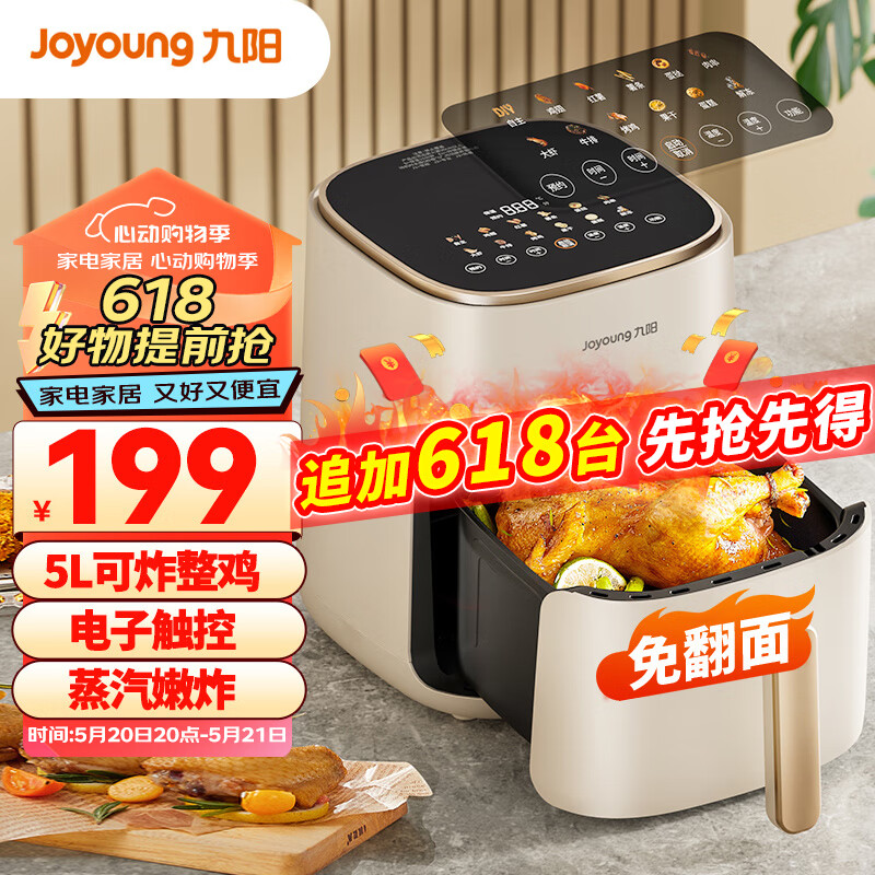 九阳(Joyoung)不用翻面 电子触控 高效烘烤 蒸汽嫩炸空气炸锅 家用5L大容量 薯条机电炸锅 KL50-V516价格:199.00元!