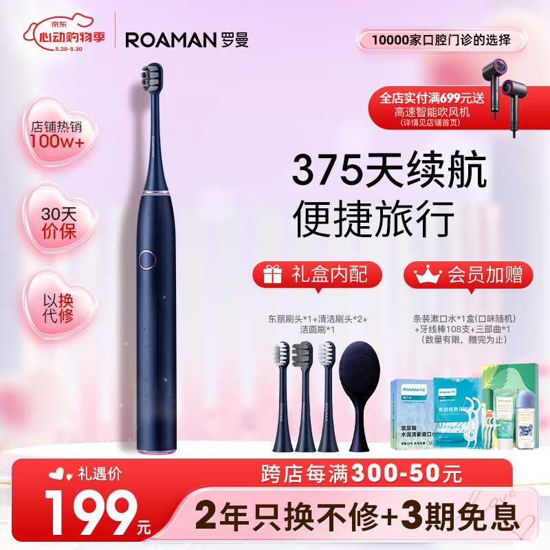 罗曼(ROAMAN)【520礼物】智能声波电动牙刷情侣款生日礼物 5种模式牙医推荐 网红小果刷1年续航 深空蓝款价格:199.00元!