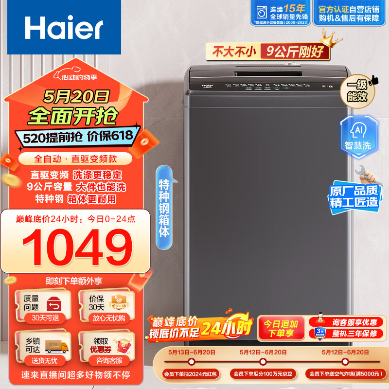 海尔(Haier)波轮洗衣机全自动家用 9公斤大容量 直驱变频 一级能效 以旧换新 原厂品质EB90B30Mate1价格:1049.00元!
