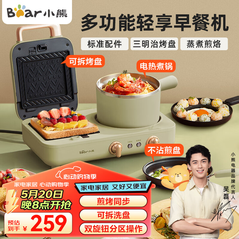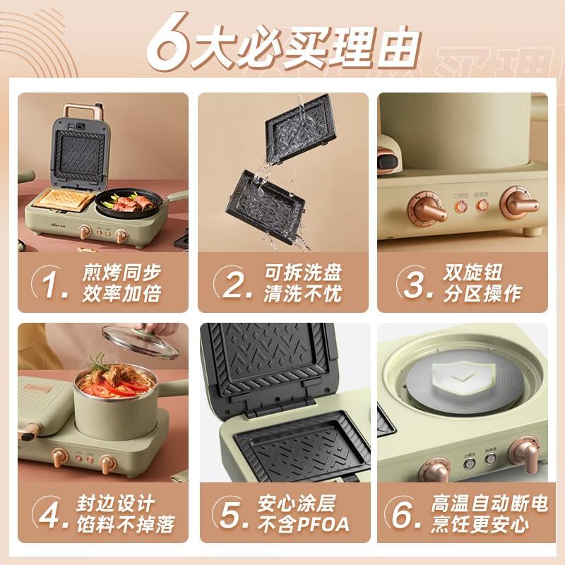 小熊(Bear) 早餐机 三明治机 电饼铛多士炉多功能料理锅多用途锅烤面包电热锅电火锅 【标配版】可拆卸烤盘-DSL-A13N1价格:259.00元!