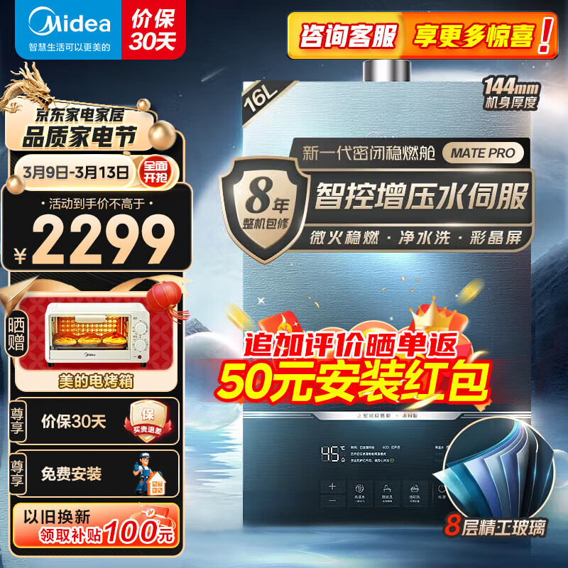 美的(Midea)16升燃气热水器 天然气 增压水伺服恒温 下置风机 彩晶屏 新一代密闭稳燃舱 JSQ30-MATE Pro尘隐价格:2299.00元!