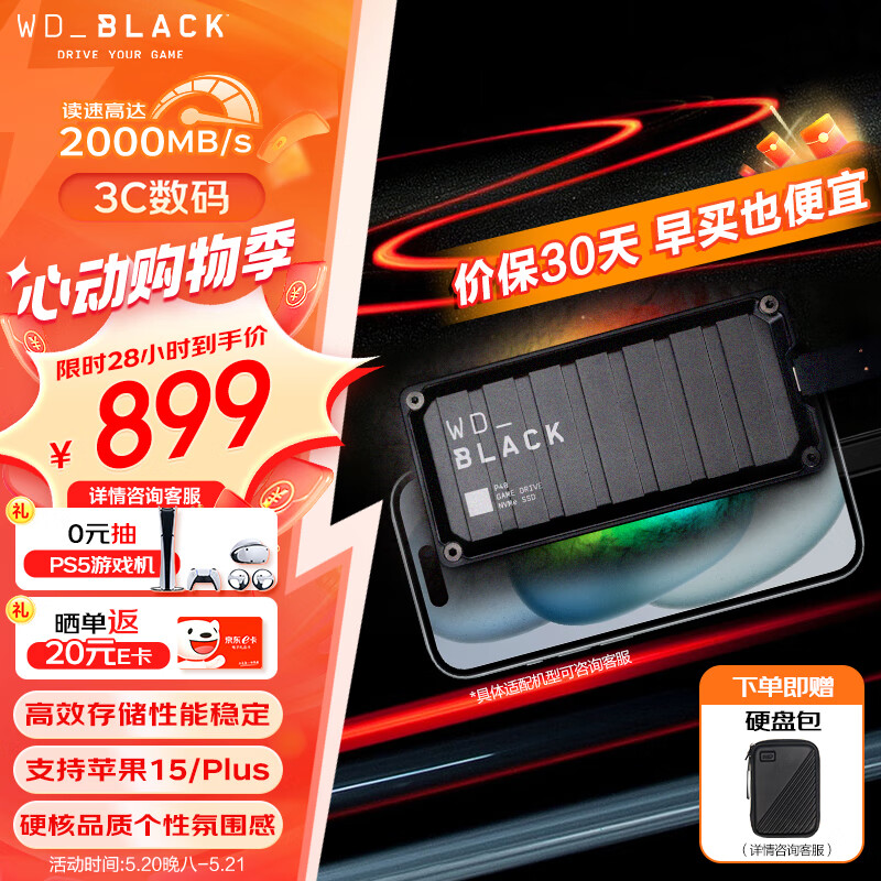 西部数据(WD)1TB NVMe 移动固态硬盘(PSSD)P40 type-c 游戏硬盘ssd外接xbox手机笔记本拓展存储2000MB/s价格:899.00元!
