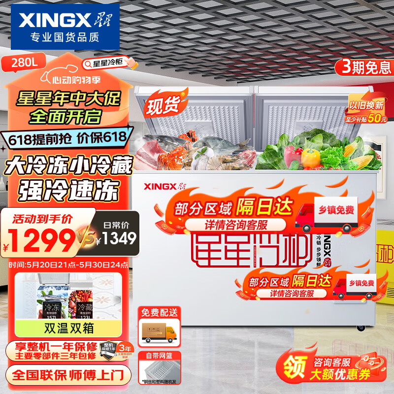 星星(XINGX) 280升 商用卧式冰柜 左冷冻右冷藏 卧式冰箱 顶开门双温双箱冷柜 BCD-280E价格:1299.00元!