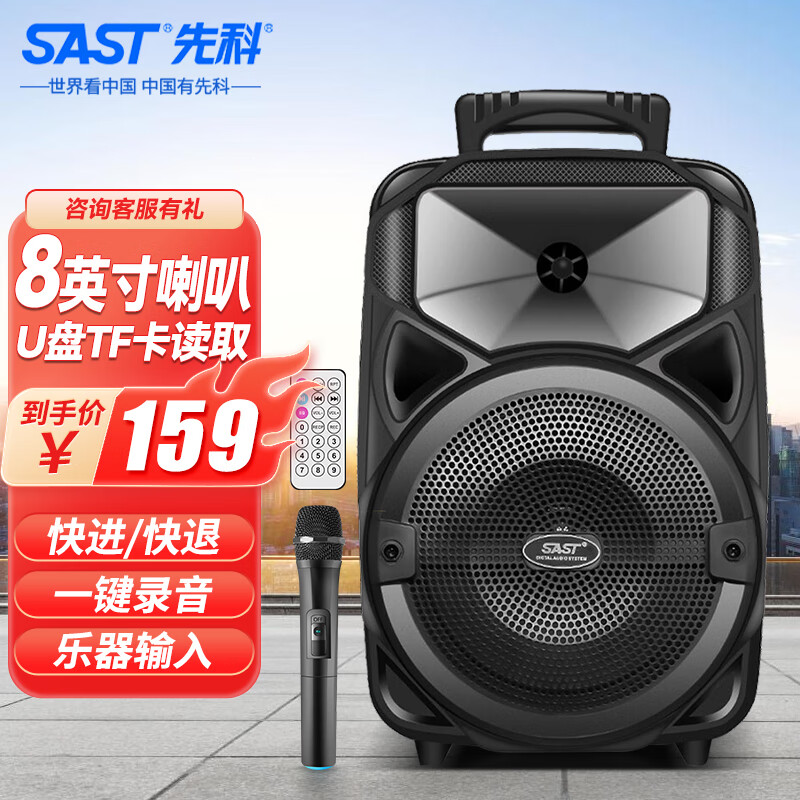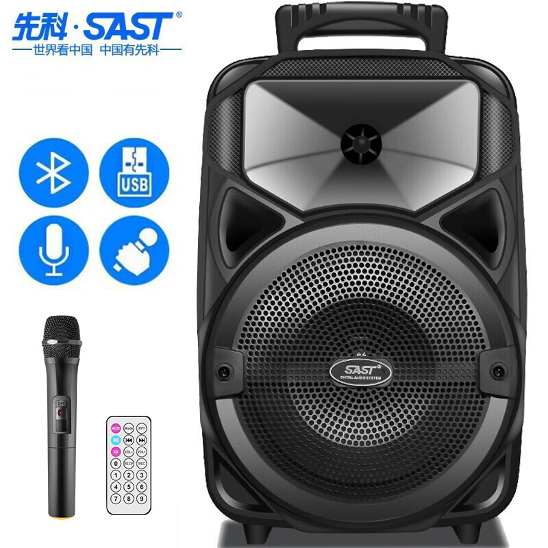 先科A69 8英寸广场舞音响户外大功率移动拉杆音箱无线蓝牙大音量K歌专用便携式单话筒麦克风版价格:159.00元!