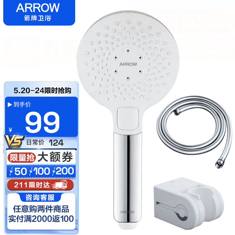 箭牌(ARROW) 手持花洒增压花洒淋浴喷头套装手持洗澡莲蓬单头卫浴套装三件套 银色 三档出水手持花洒套装价格:123.75元!