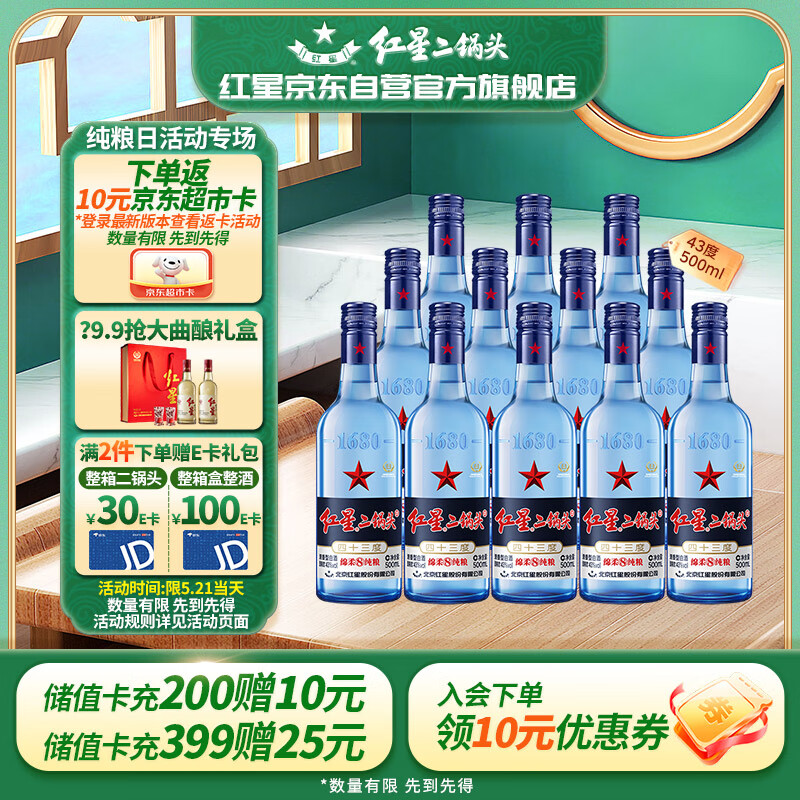 红星二锅头蓝瓶绵柔8陈酿 清香型白酒 43度 500ml*12瓶 整箱装 口粮酒价格:398.00元!
