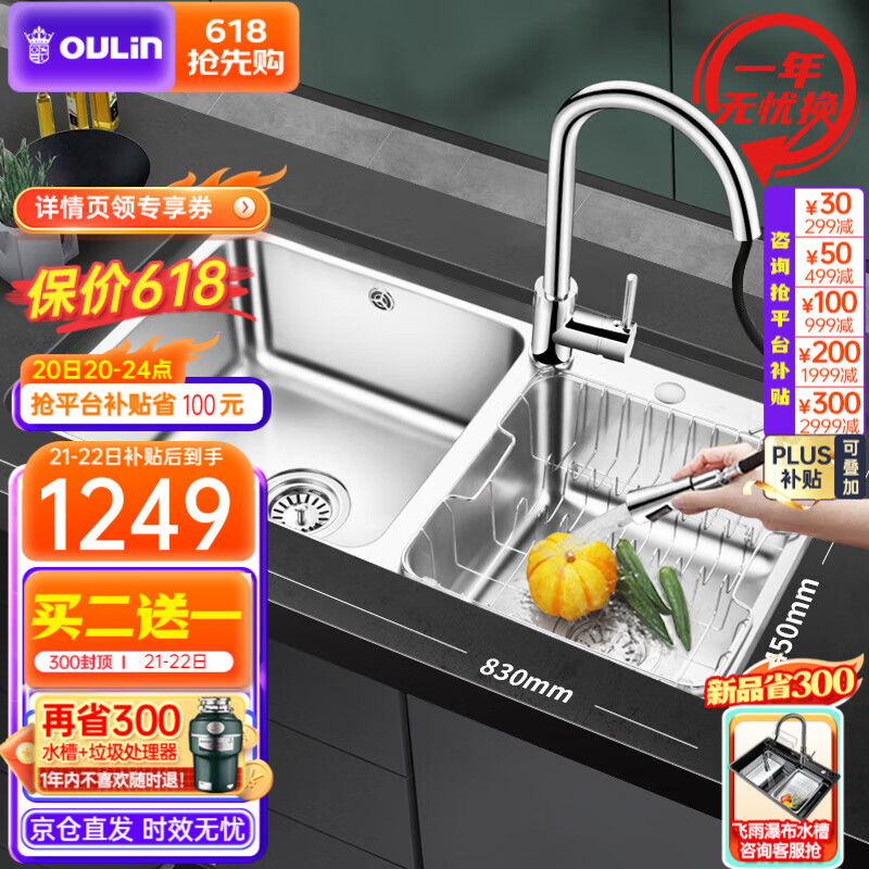 欧琳(OULIN)水槽双槽304不锈钢洗菜盆洗碗池 加厚厨房大双槽JD655-B+抽拉龙头价格:1379.00元!