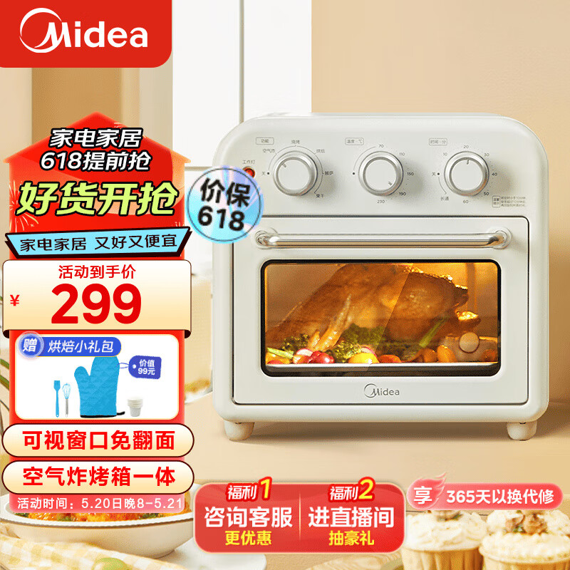美的(Midea)家用多功能空气炸锅电烤箱一体机 高效脱脂/可视化/循环热风免翻面 15L浅杏色PT1510【仓库2】价格:299.00元!