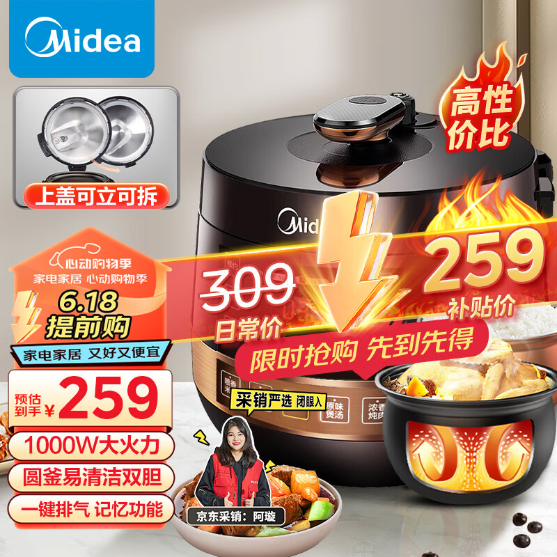 美的(Midea)全自动智能预约电锅 家用易清洁不粘双胆一键排气煲汤炖肉保温YL50Easy203电饭煲高压锅2-6人价格:309.00元!