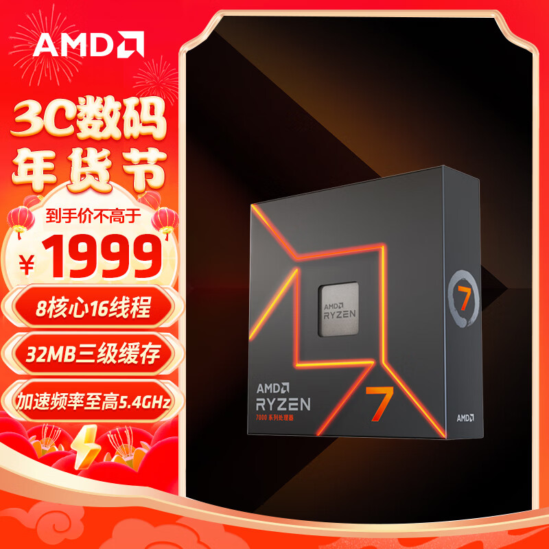 AMD 锐龙7 7700X处理器(r7) 8核16线程 加速频率至高5.4GHz 105W AM5接口 盒装CPU价格:1999.00元!