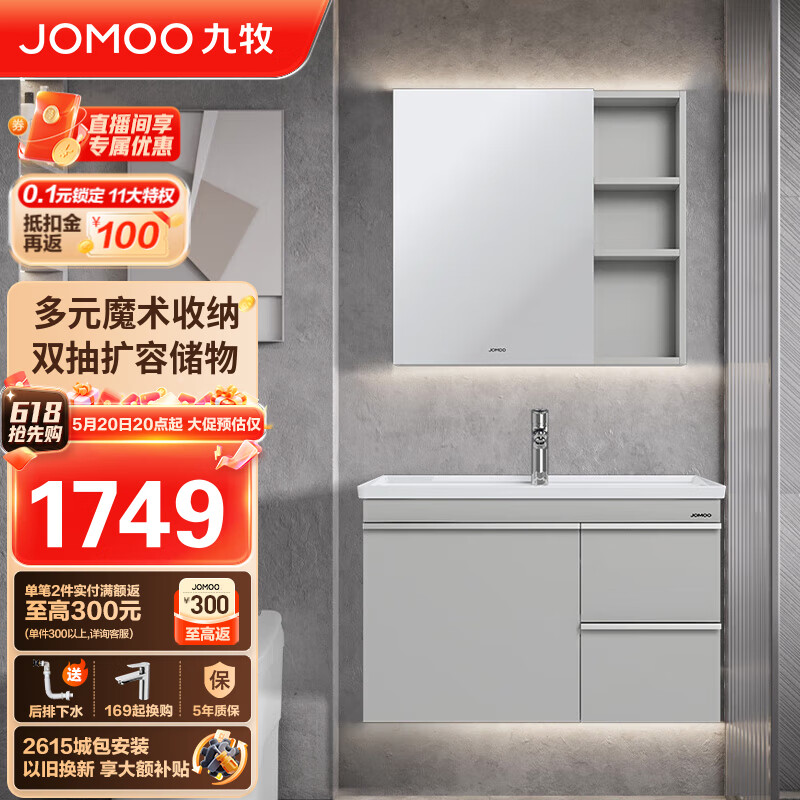 九牧(JOMOO)浴室柜 抗菌陶瓷一体盆极简悬挂式双抽拉 浅灰80cm A2704-117Y-1价格:2249.00元!