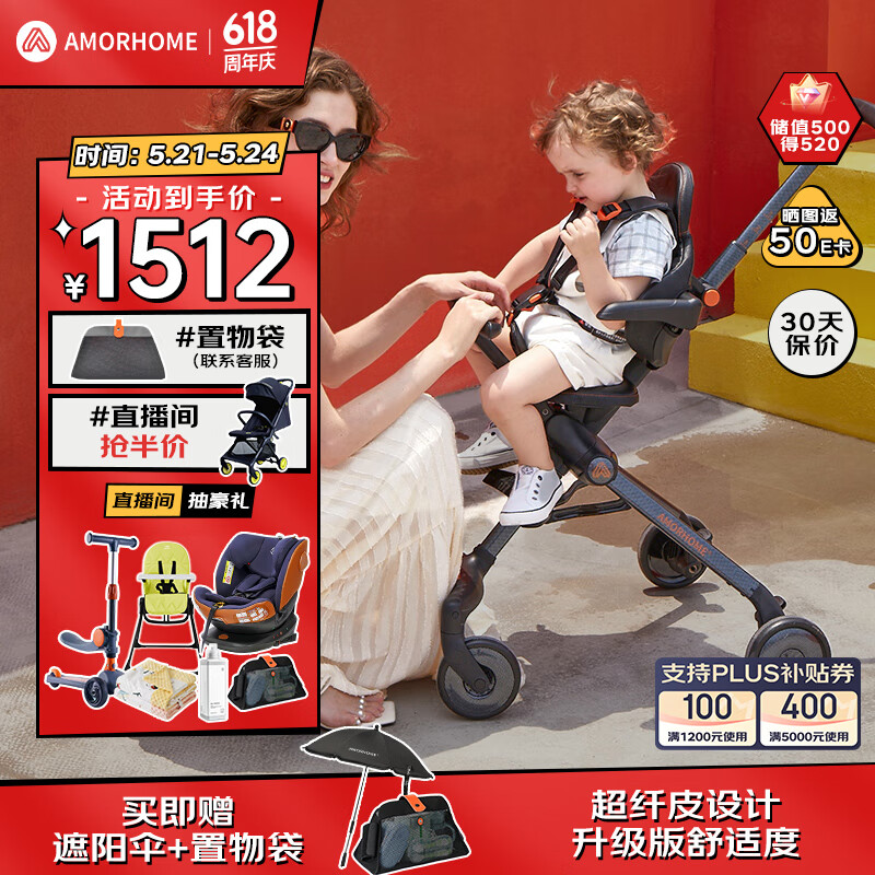AMORHOME遛娃神器婴儿推车可坐可躺轻便折叠宝宝溜娃折叠小 金刚pro橘色价格:1899.00元!