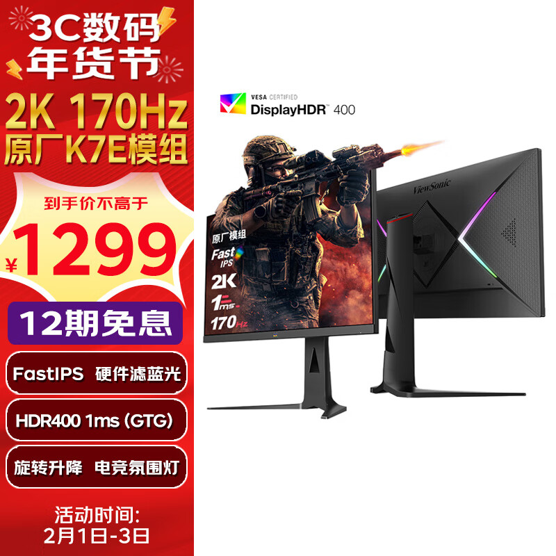 优派27英寸 原厂背光 2K 170Hz FastIPS 1ms(GtG) HDR400 100%sRGB 旋转升降猛擎满血电竞显示器VX2781价格:1599.00元!