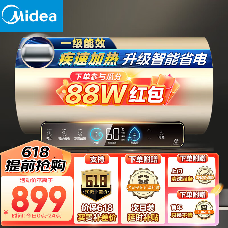 美的(Midea)家用60升3300W大功率电热水器速热大水量长效免换镁棒珐琅无缝内胆一级能效智能省电F6032-JE3(HE)价格:1099.00元!